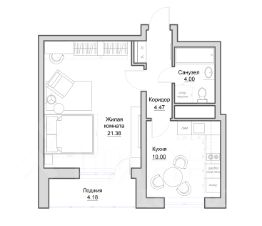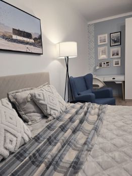 • Просторная, светлая жилая комната с полноценной кроватью шириной спального места 160 см с ортопедическим матрасом, телевизором 55, уютной рабочей зоной и вместительным шкафом 230 см шириной.