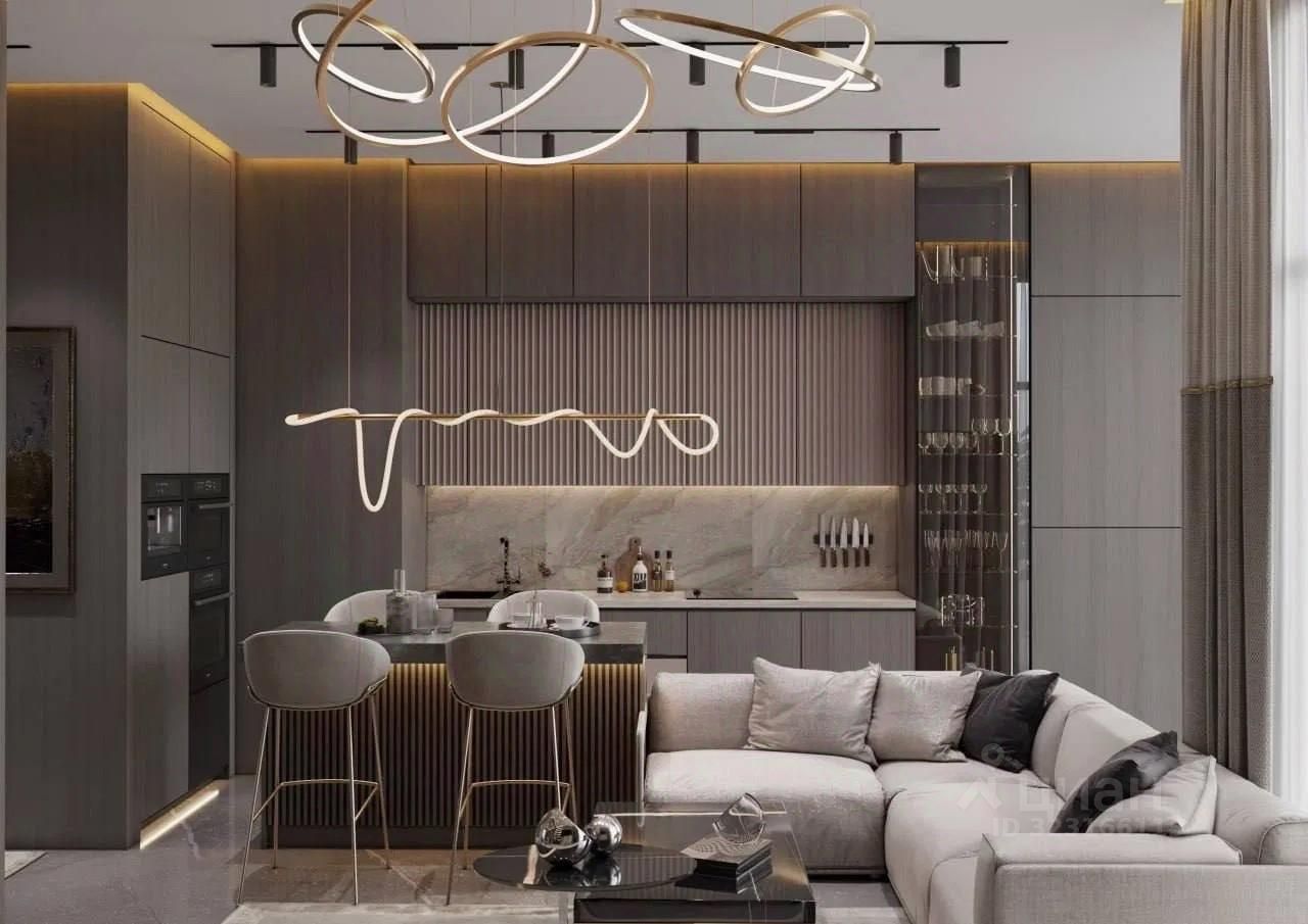 Современная двухкомнатная квартира в авангардном жилом комплексе на набережной Москвы-реки. Архитектура, ориентированная на водные просторы и панорамные виды.