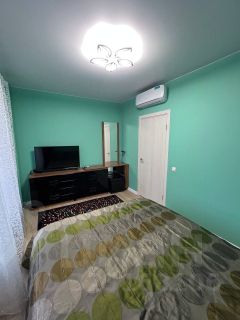 Находится на 8 этаже 23-этажного дома. Квартира состоит из кухни-гостиной, 2 отдельных спален, 2 санузлов (один совмещенный с ванной и стиральной машиной, второй с унитазом и раковиной). В квартире имеется все необходимое для комфортного проживания: кухонный гарнитур с варочной панелью на 3 камфорки, духовым шкафом, вытяжкой, посудомоечной машиной, СВЧ, и холодильником; 2 телевизора; 3 кондиционера.
