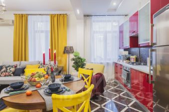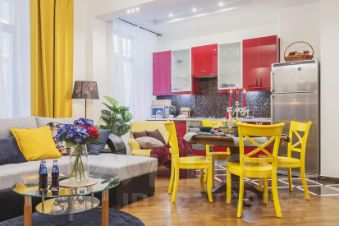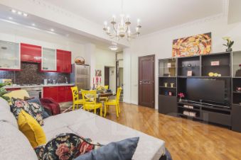 Еще один очевидный плюс этой квартиры - близость к метро Маяковская (3 минуты пешком). Спальные комнаты оснащены двуспальными кроватями, платяными шкафами, комодом, светильниками, а также плотными портьерами. Гостиная совмещена с кухней, визуально разделена на обеденную зону и зону отдыха. Здесь Вы найдете ЖК телевизор с функцией SMART TV, раскладной диван, настольные игры. Балкон прилегает к гостиной. Окна выходят в тихий двор. Кухня оборудована по последнему слову техники: холодильник, микроволновая печь, электрический чайник, посудомоечная машина, электрический чайник, вытяжка, варочная панель и духовой шкаф.