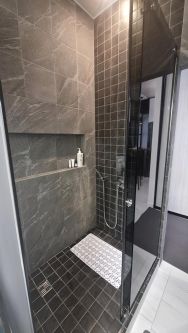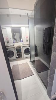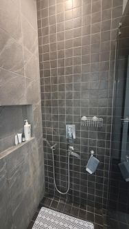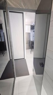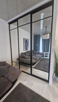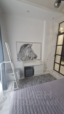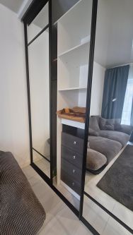 Есть всё необходимое для проживания, встроенная кухня с комплектом бытовой техники : духовой шкаф, свч печь, индукционная плита, холодильник, чайник .