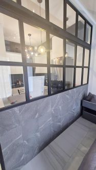 Планировка : просторная кухня и отдельная гостиная с большой гардеробной комнатой .