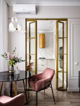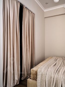 В квартире 2 изолированные комнаты (спальня для тех, кто не любит спать в маске и при этом не любит яркого света- прямого окна на улицу нет, мозаичная стеклянная часть стены пропускает необходимое количество солнечного света, есть гардеробная ниша, и вторая комната без мебели- можно использовать как детскую или кабинет (детская мебель с фото вывезена- есть встроенный шкаф ) Просторная гостиная и кухня.