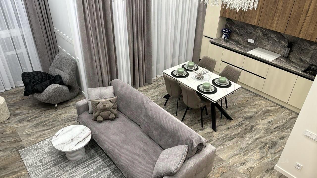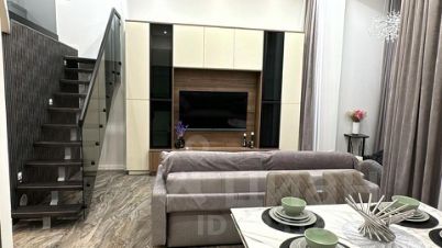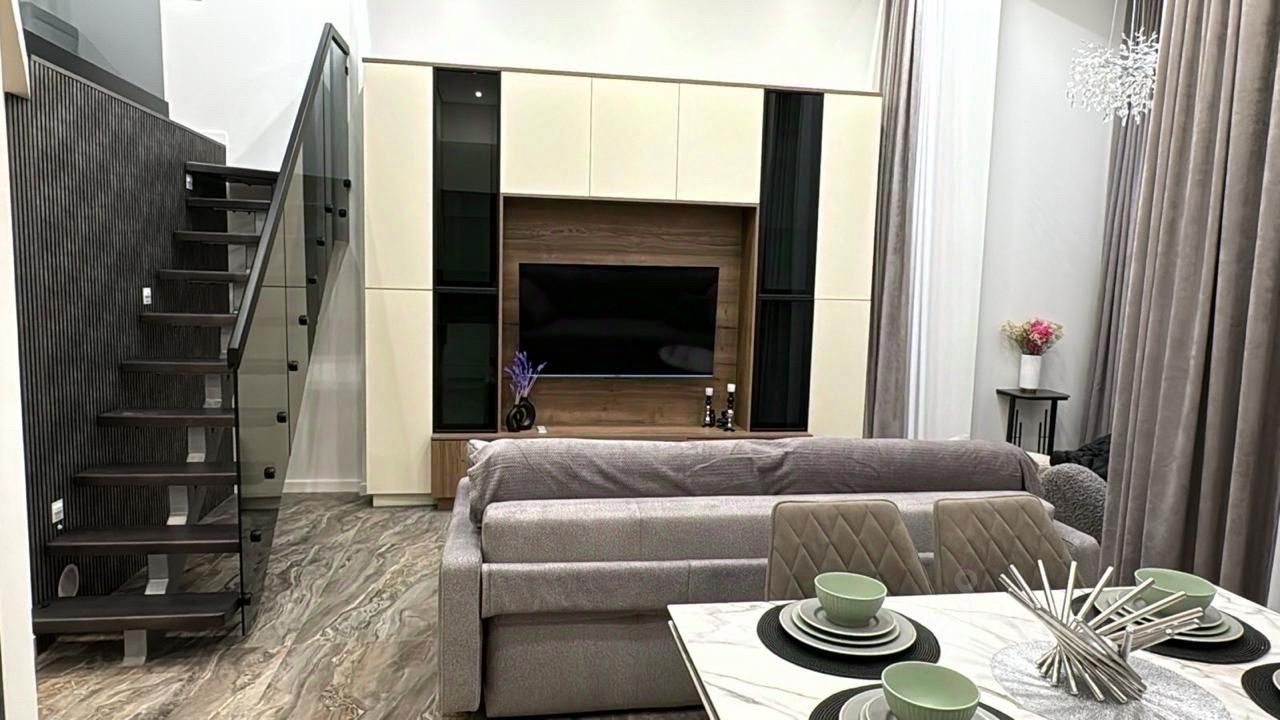 Квартира двухуровневая, на втором этаже расположилась уютная спальня. На первом уровне находится шикарная гостиная и функциональная кухня.