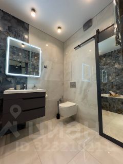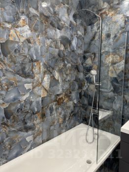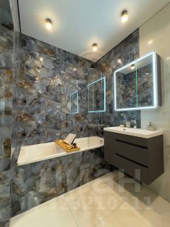 Большая объединенная ванная комната с постирочным шкафом выполнена с использованием премиального керамогранита!