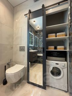 Ниша в ванной комнате со стиральной машиной также закрывается сдвижной дверью с зеркалом.