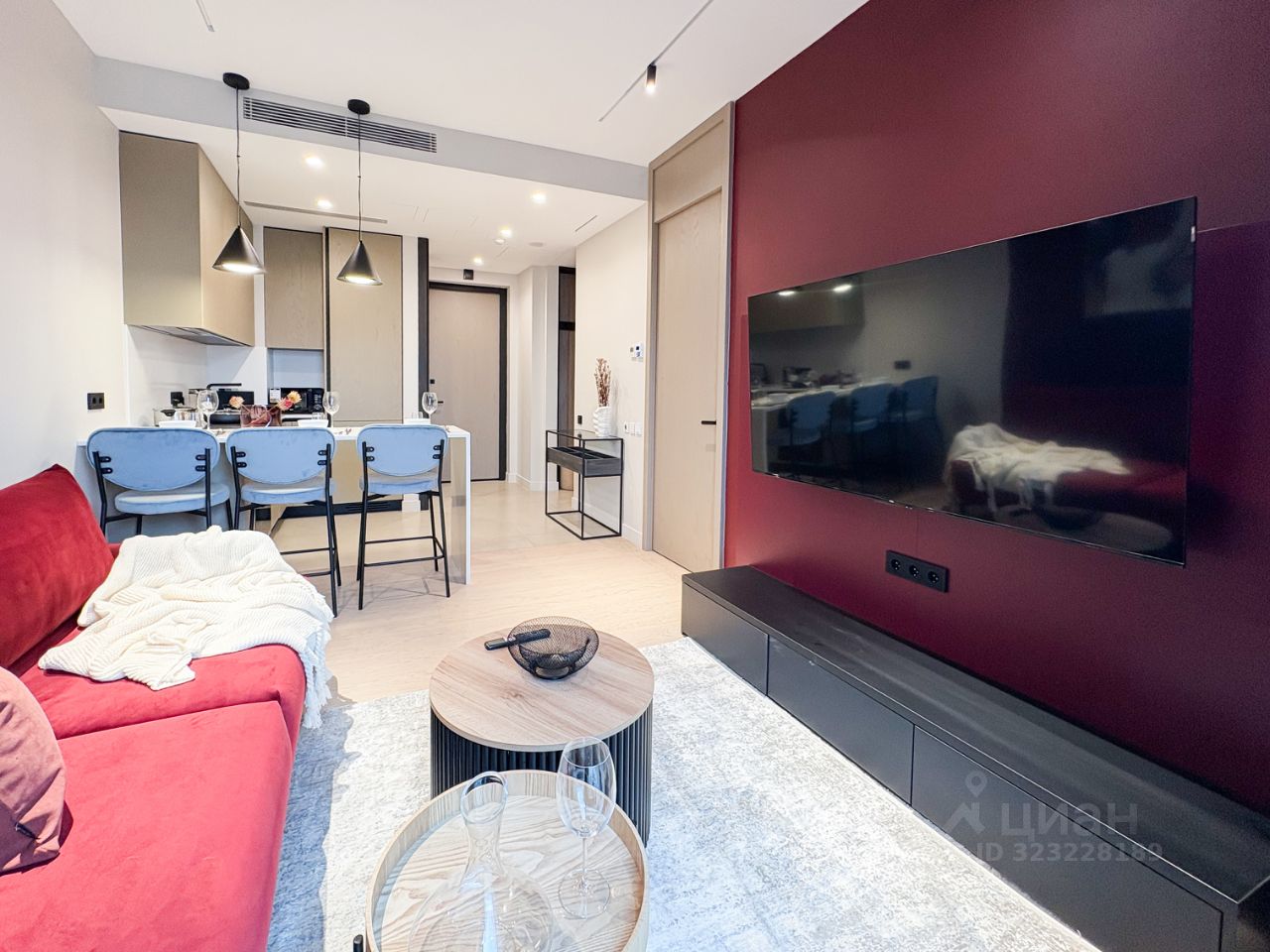 - гостиная зона оснащена дизайнерским диваном, тв-тумбой, телевизором, кресло поворотная;