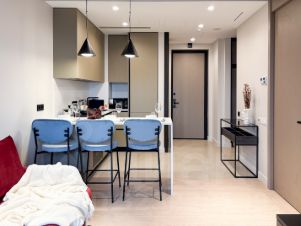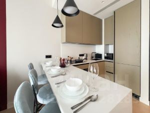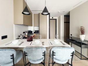 - кухонная зона оборудована необходимой бытовой техникой: варочная панель, духовая печь, свч, посудомоечная машина, вытяжка, сушилка для посуды. Обеденный стол сервирован на 3 персоны, что позволит принимать трапезы с гостями;
