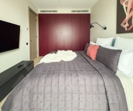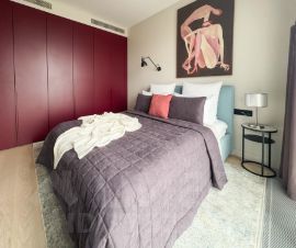 - спальня оборудована двуспальной кроватью, с телевизором, прикроватными тумбами и шкаф.