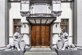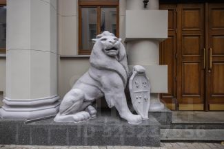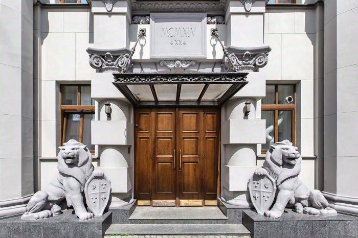 Парадный вход оформлен тремя арочными нишами и двумя скульптурами царственных львов, которые стали символом дома.