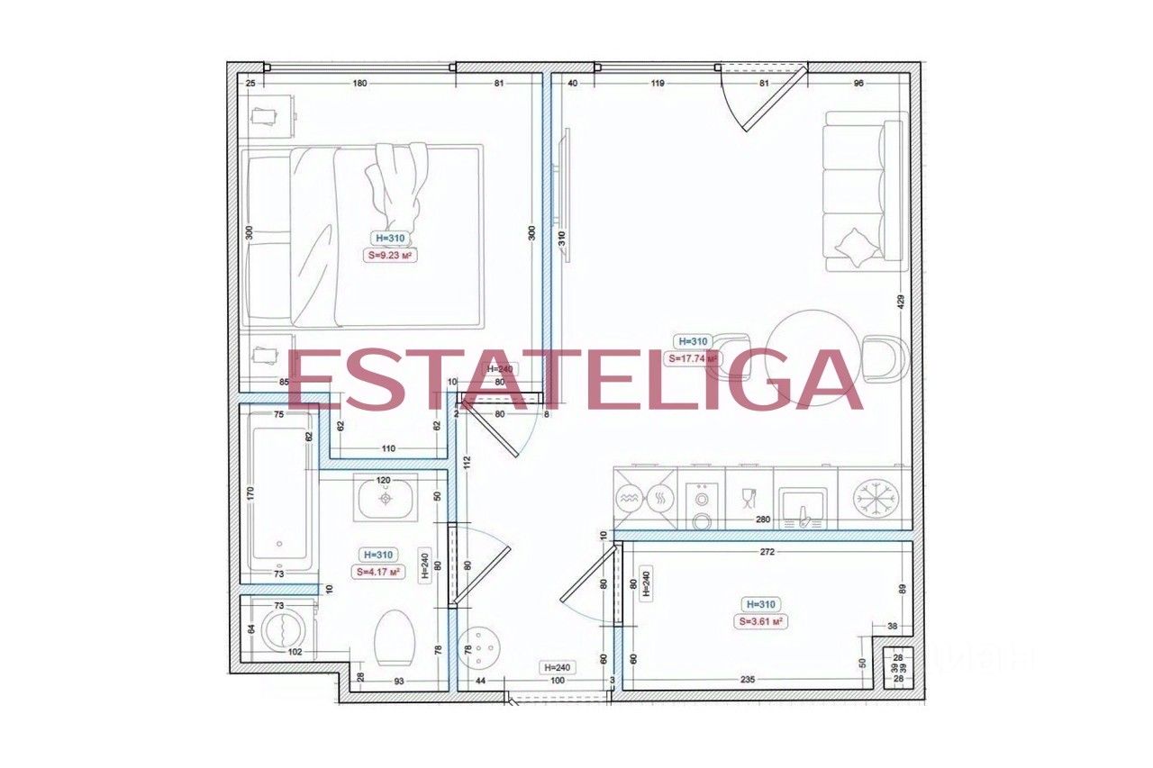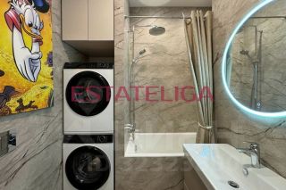 Квартира оборудована встроенной бытовой техникой: посудомоечная машина, варочная панель, вытяжка, духовой шкаф, микроволновая печь, холодильник, стиральная и сушильная машины, телевизор. Установлен кондиционер.