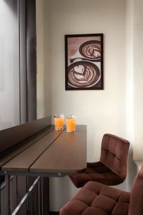 В квартире две комнаты: отдельная спальня, в которой большая кровать с удобным матрасом, и совмещенная кухня-гостиная, в которой раскладной диван с полноценными спальными местами. К гостиной примыкает балкон с раскладным столиком и стульями.