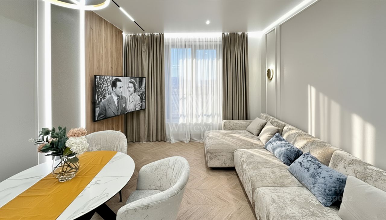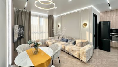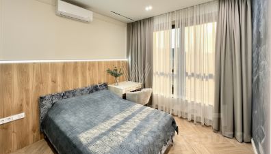Квартира с двумя спальнями общей площадью 68 м² в комплексе бинес-класса Level Причальный на шестом этаже. Выполнена дизайнерская отделка в современном стиле. Интерьер оформлен в лаконичных светлых тонах. Спланирована кухня-гостиная с обеденной зоной, мастер-спальня с собственным санузлом, вторая спальня, гардеробная, гостевой санузел, прихожая. Квартира полностью меблирована и оборудована бытовой техникой. Из окон открывается вид на улицу.