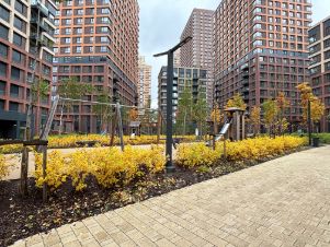 Есть закрытый внутренний двор с ландшафтным дизайном и множеством зон для игр и отдыха. Спокойное и приятное окружение.