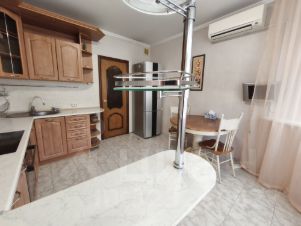 В квартире выполнен качественный евроремонт. Просторная кухня оснащена мебелью и всей необходимой техникой: холодильником, кондиционером и стиральной машиной. Гостиная и спальня также обставлены мебелью, есть телевизор. В ванной комнате установлена ванна. Для удобства жильцов в доме имеются пассажирский и грузовой лифты, мусоропровод, а также наземная парковка.