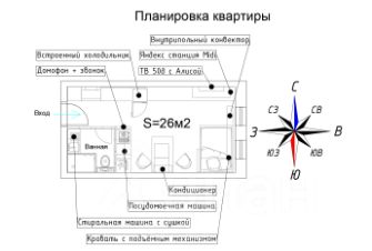 • Техника (оснащение): Кондиционер, стиральная машина с сушкой, посудомоечная машина, встроенный холодильник, электрический чайник, духовой шкаф, варочная поверхность, СВЧ-печь, утюг, гладильная доска, пылесос, сушка белья, накопительный водонагреватель 60л, ТВ 50 дюймов от Яндекса, колонка Алиса Midi.