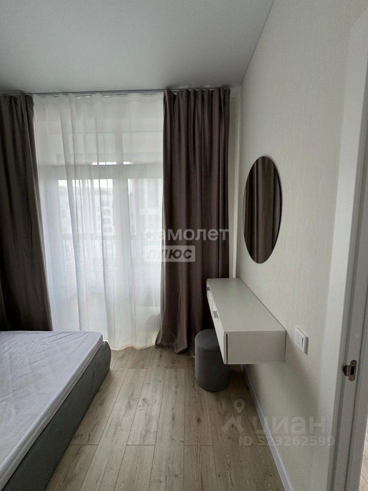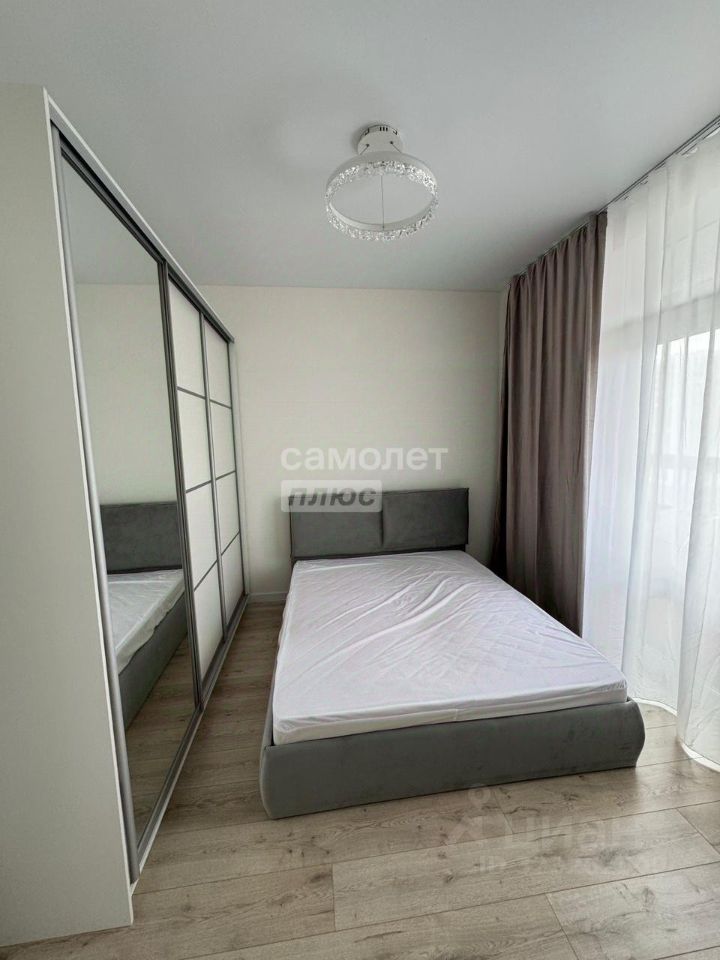 В комнате расположена большая двуспальная кровать и вместительный шкаф купе для хранения одежды