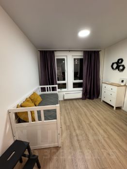 В квартире есть всё необходимое для комфортного проживания. Пространство оформлено с учётом современных тенденций дизайна, поэтому здесь приятно находиться. На кухне и в комнате установлена мебель, а также имеется вся необходимая техника: холодильник и стиральная машина. В ванной комнате установлена душевая кабина.