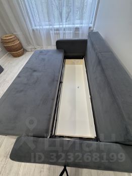 -гостиная: шкаф, раскладным серым диваном Аскона с ящиком для белья и анатомическим матрасом для ежедневного сна (СМ 163/200), тумба ТВ, телевизор, кондиционер