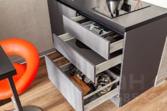 Удобная кухонная зона с современной техникой (варочная поверхность, встроенный мини холодильник, чайник, микроволновая печь). Посуда и столовые приборы.