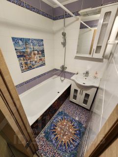Ванная комната оборудована ванной, а планировка квартиры включает одну большую лоджию (выход из спальни).