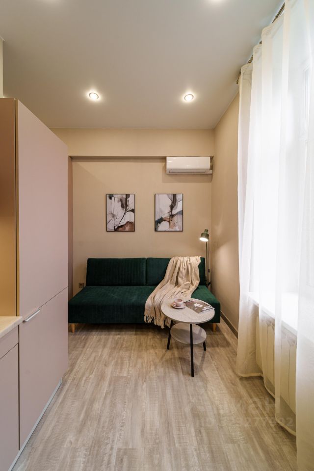 Студия теплая, светлая, расположена на высоком 1 этаже 5-этажного кирпичного здания. Окно выходит в тихий двор.