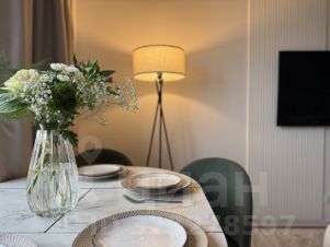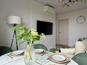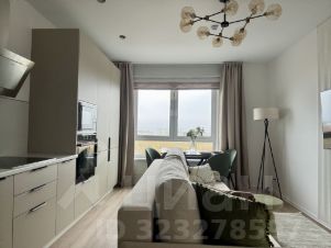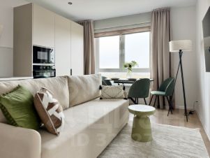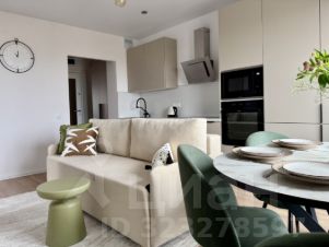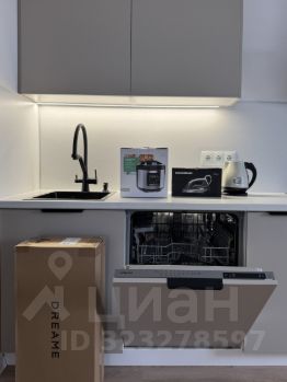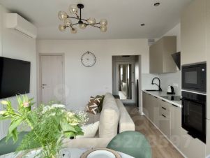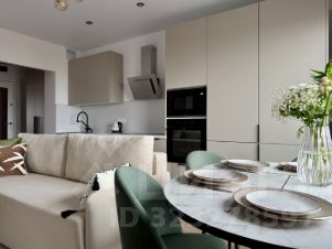 Кухня - гостиная укомплектована полностью: кондиционер (сплит-система), холодильник (встроенный), индукционная плита на 4 конфорки, духовка с конвекцией, микроволновая печь (встроенная), посудомоечная машина полноформатная, чайник, фильтр для воды, диван со спальным местом, Smart-TV, роутер. Стол расположен у окна с шикарным видом на перспективу города. Окна расположены с восточной стороны (на восход).
