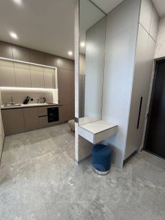 Квартира выполнена в современном стиле с использованием качественных материалов. В комнатах и на кухне есть вся необходимая мебель, которая создаёт уют и комфорт. Из техники вы найдёте: кондиционер, холодильник, телевизор, стиральную и посудомоечную машины, два кондиционера, приточно-вытяжная вентиляция, теплые полы в коридоре, на кухня фильтр для воды, обратный осмос и измельчитель. В ванной комнате установлена душевая кабина, а также есть отдельный санузел.