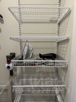 Просторная гардеробная комната со множеством полок, вешалками, ящиками и местом для хранения. Два санузла — удобно для семьи. Отдельная спальня и уютная детская (или кабинет) оформлены в современном стиле с мягкими тонами и хорошим освещением.