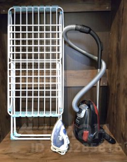Полностью укомплектована всем необходимым: два вместительных шкафа для одежды, просторная кровать 140x2000 с подъемным механизмом, что обеспечивает дополнительное место для хранения, функциональный комод, пылесос, сушилка, утюг.