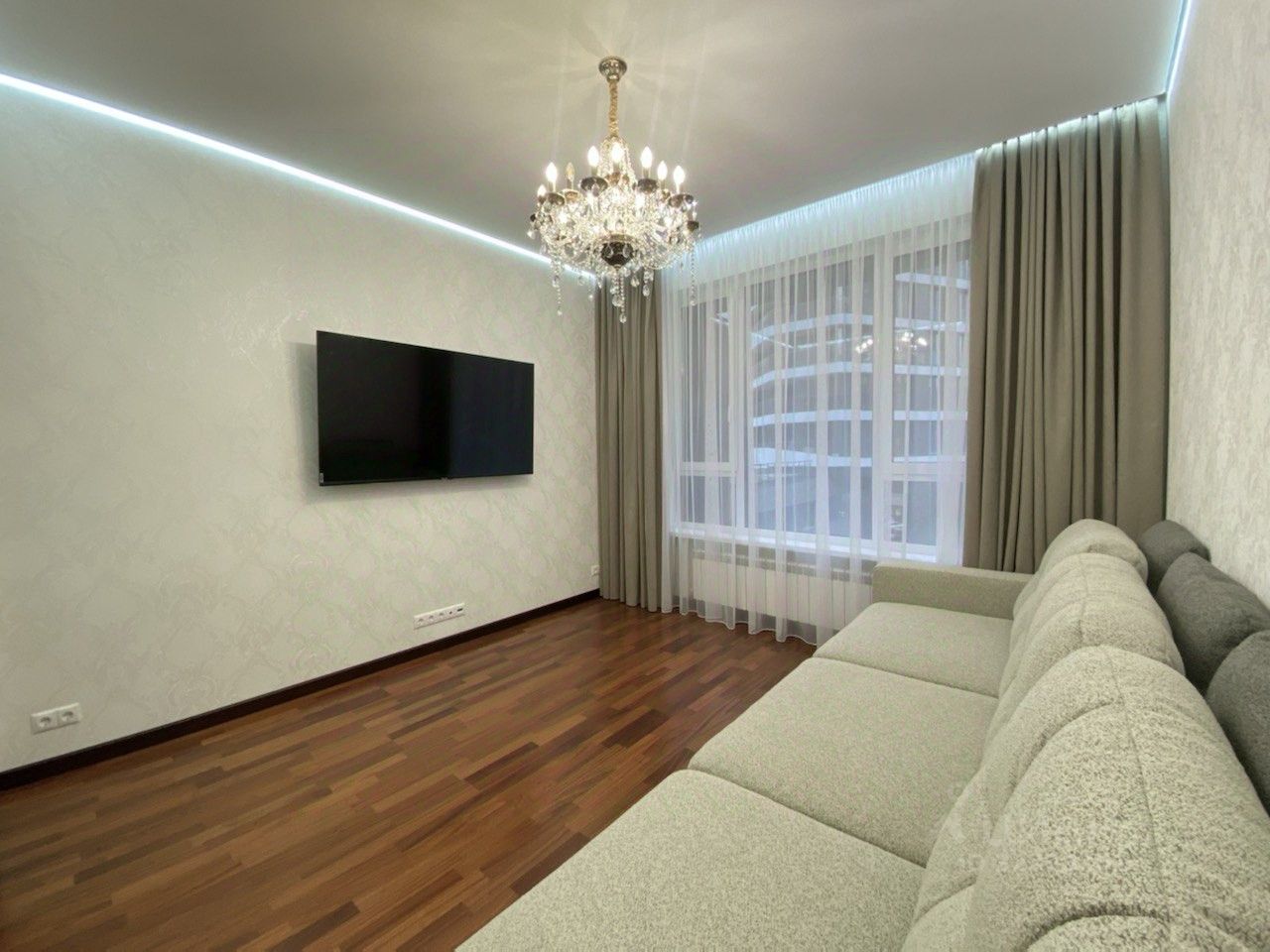 Просторная и светлая квартира полностью обустроена современной мебелью и техникой. В каждой комнате имеется кондиционер, установлена система "теплый пол". Встроенный кухонный гарнитур со всей бытовой техникой: варочная плита, духовой шкаф, посудомоечная машина, холодильник, микроволновая печь. Все готово для комфортного проживания, "заезжай-живи"! Вы будете первыми жильцами!