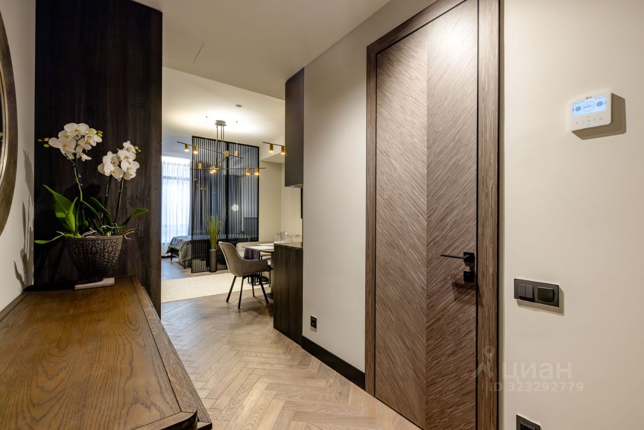 В отделке использованы натуральные материалы  паркет массив дуба, натуральный камень, сантехника Villeroy&Boch, Laufen, высокие двери 2,3 м, встроенная кухня с бытовой техникой.  Декор  свет от компании Jung, Natural Concepts.