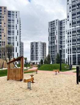 закрытый двор-парк с концепцией "Двор без машин", где тихо и уютно, много зелени, а также благоустроенные зелёные пространства на территории района, променад и эко-тропы, уютные городские гостиные
