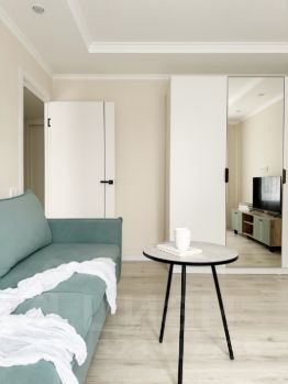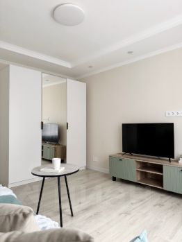- две изолированные комнаты: спальня (двуспальная кровать, рабочее место, шкаф, комод) и большая комната (раскладной диван, телевизор с тумбой ,шкаф)