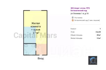 Предлагается 1-комнатная квартира общей площадью 20 м² в ЖК "Апарт-отель YE'S Ботанический сад" недалеко от станции метро "Ботанический сад". Для комфортного проживания в наличии имеется вся необходимая мебель. Окна обращены на улицу.