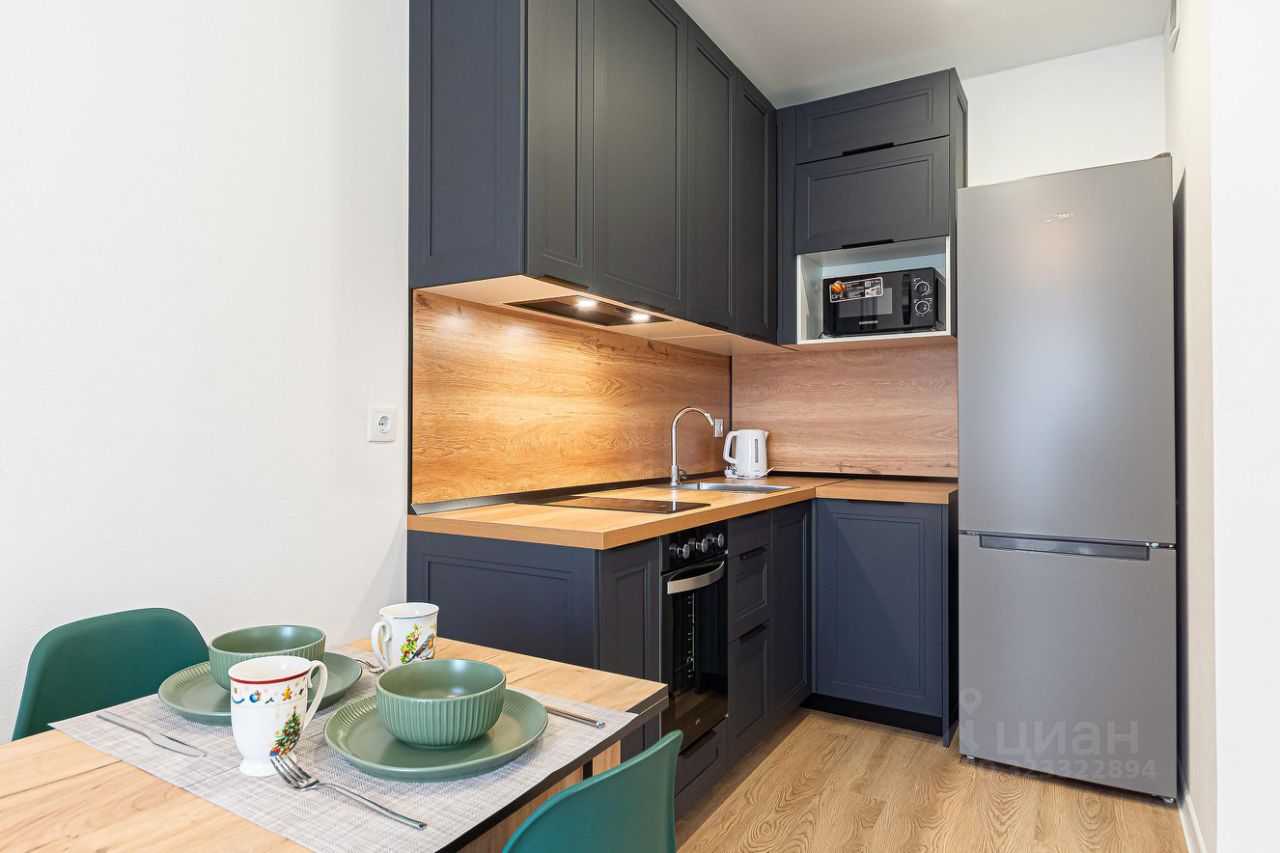На кухне: духовка, варочная панель, вытяжка, микроволновка, посудомоечная машина, новая посуда и кухонные принадлежности.