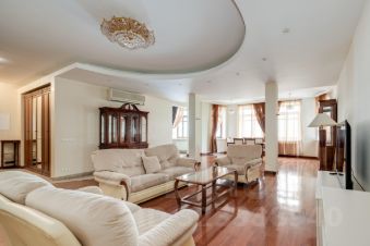 Просторная трехкомнатная квартира площадью 160 м² в доме бизнес-класса на Малом Каковинском переулке, в самом сердце Арбата. Современный дизайнерский ремонт в английском стиле с использованием темного дерева, авторские люстры и многоуровневые потолки создают атмосферу уюта и статуса. Просторная гостиная объединена со столовой и кухней, идеально подходит для приема гостей и семейных ужинов. В квартире две изолированные спальни, в одной — застекленная лоджия с видом во двор.