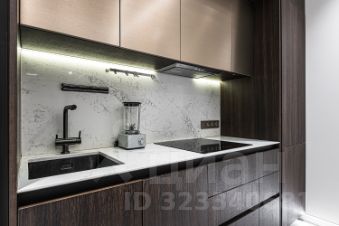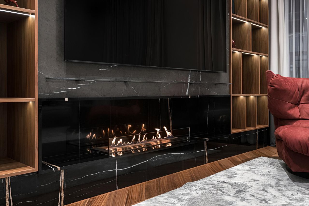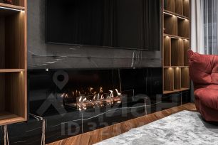 • Просторная зонированная кухня-гостиная: гостиная с ТВ-зоной и газовым камином и кухня-ниша со встроенной техникой премиальных брендов (Meile, Whirlpool).