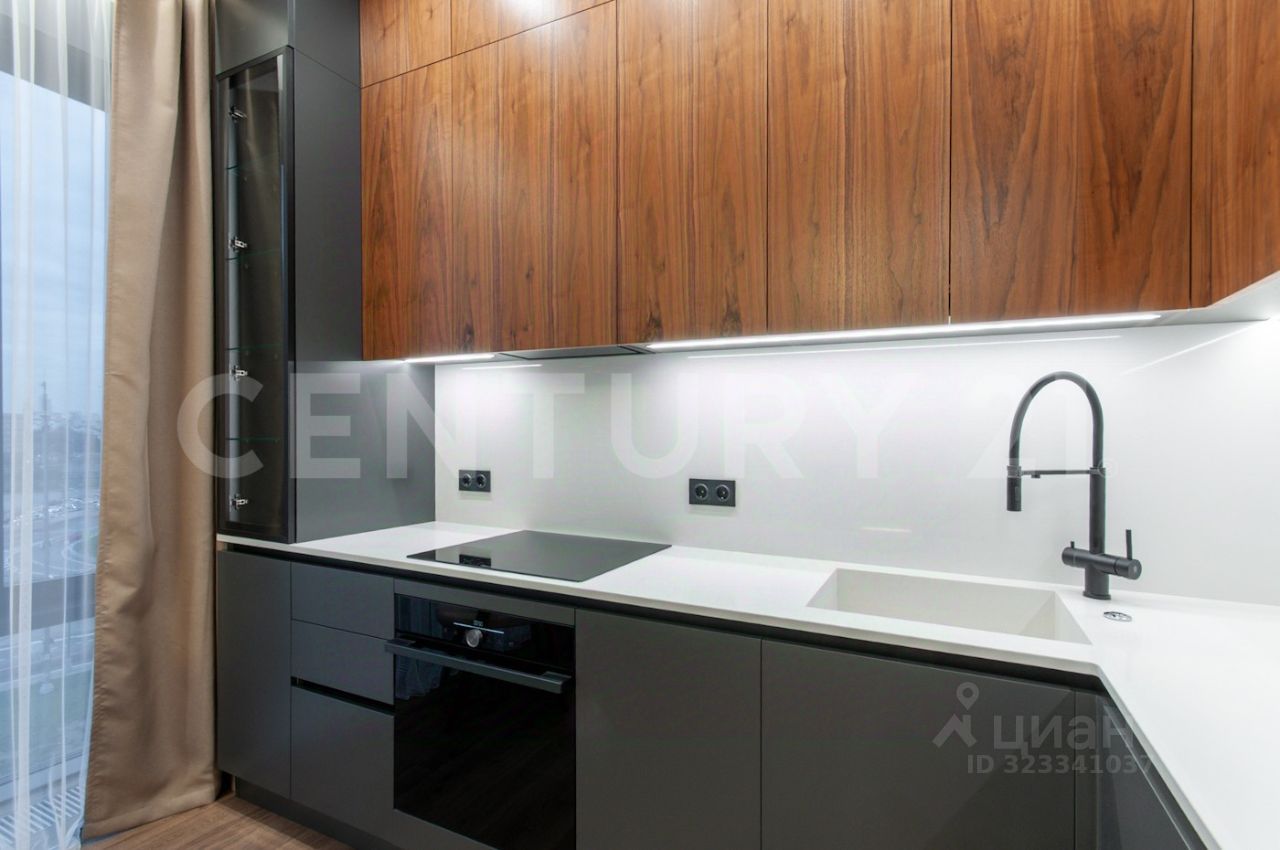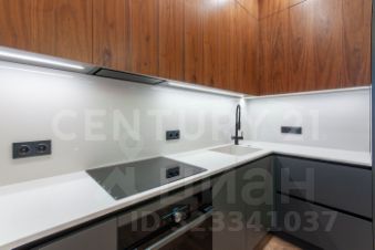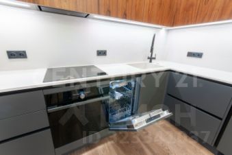 - стильный кухонный гарнитур оборудован современной встроенной бытовой техникой (варочная панель, вытяжка, духовой шкаф с функцией СВЧ, посудомоечная машина, двухкамерный холодильник)
