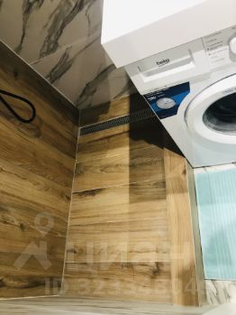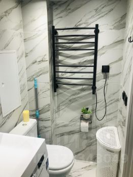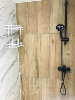 Совмещенный санузел в плитке до потолка, поддон также выполнен из плитки, качественная сантехника, стиральная машина в санузле, электрический большой полотенцесушитель.