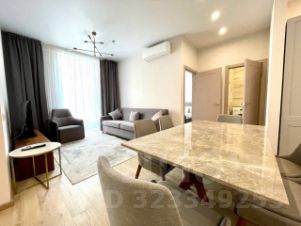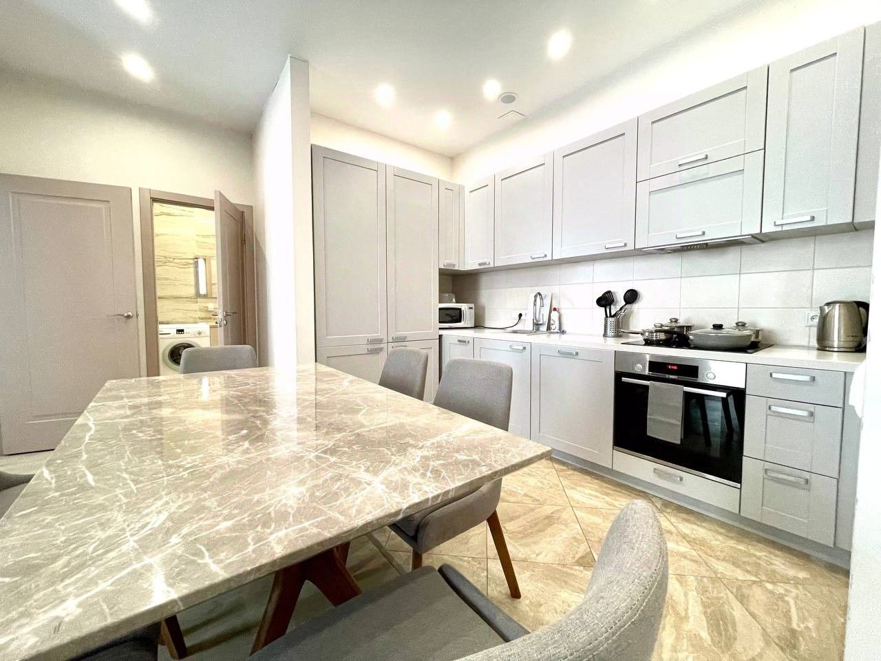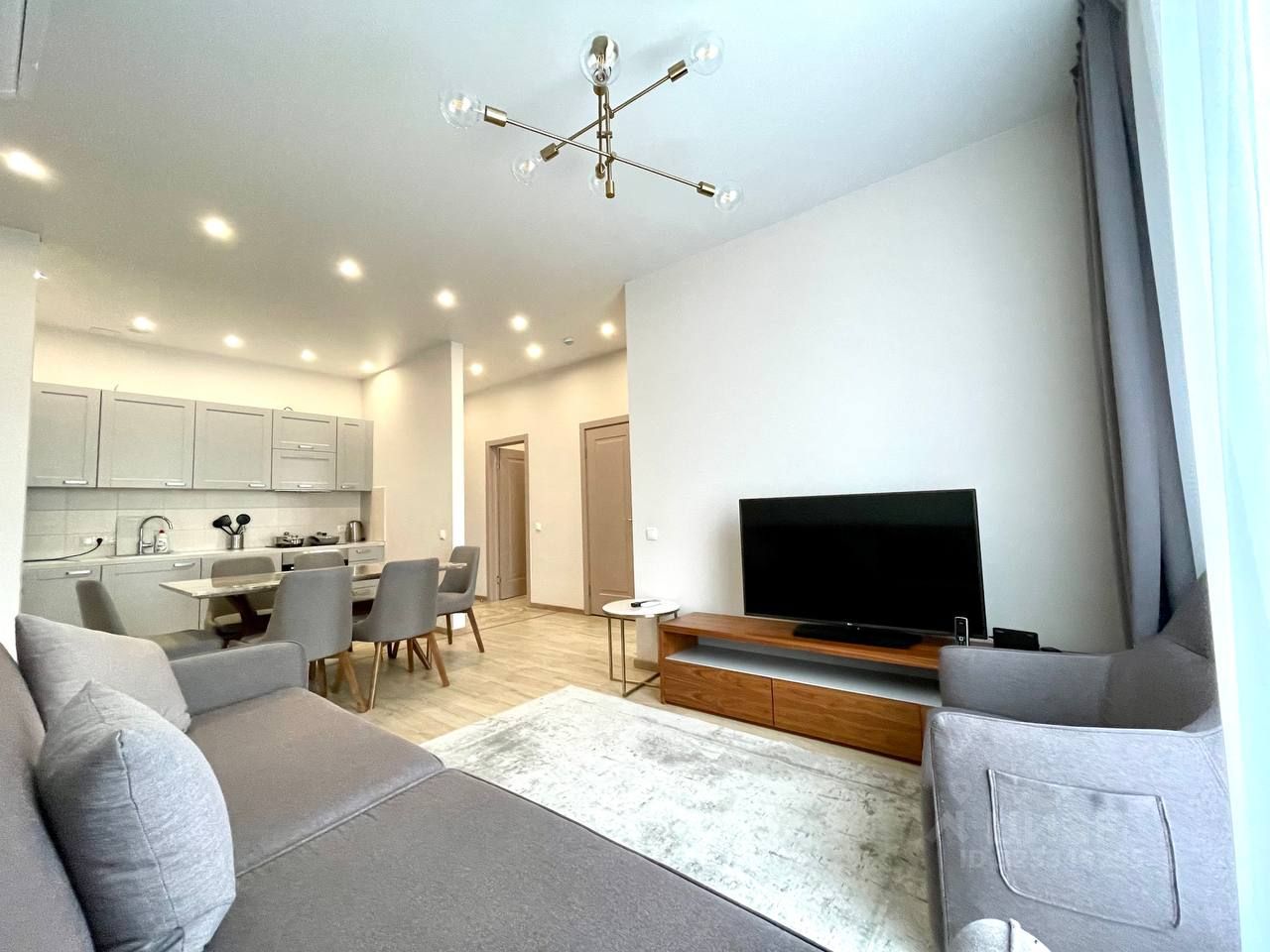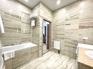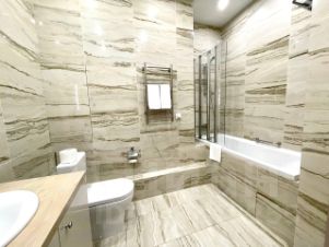 В квартире сделан современный евроремонт. Есть вся необходимая мебель на кухне и в комнате. Из техники: кондиционер, холодильник, телевизор, стиральная и посудомоечная машины. Планировка включает совмещённый и отдельный санузлы