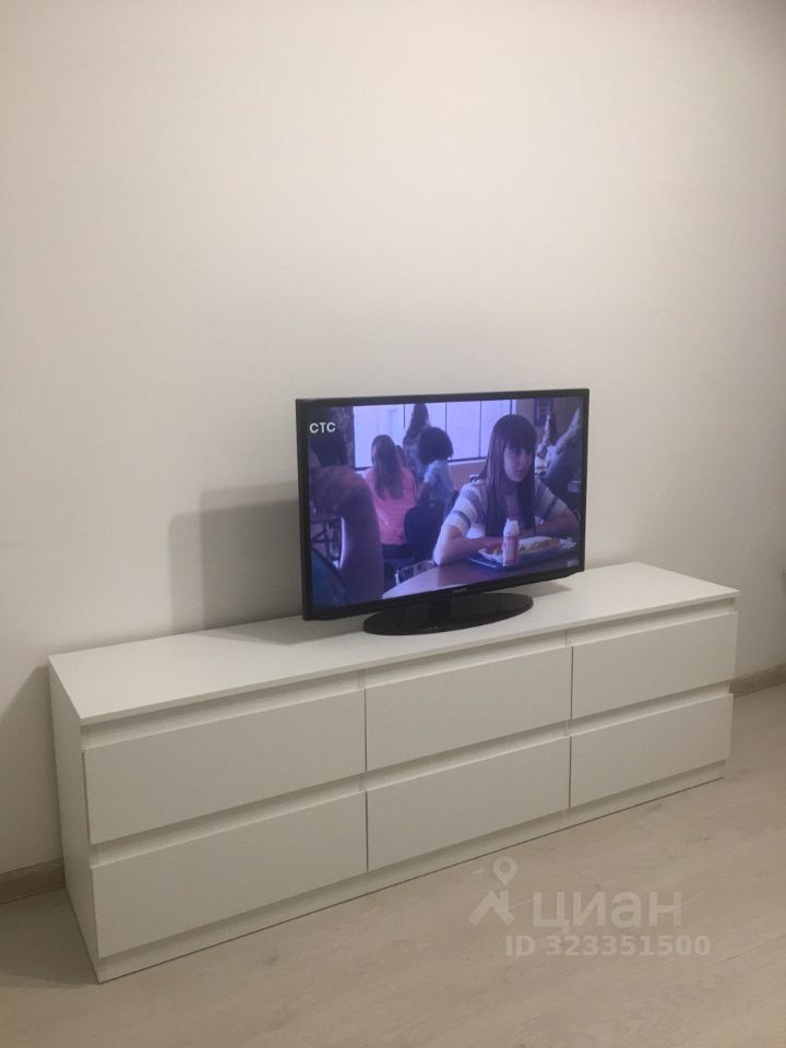 Гостиная оснащена раскладным диваном, телевизором, настольной тумбой и большим шкафом с вешалками.