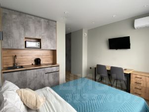 В студии выполнен качественный евроремонт. Интерьер продуман до мелочей! Апартаменты полностью укомплектованы всей необходимой мебелью и техникой: