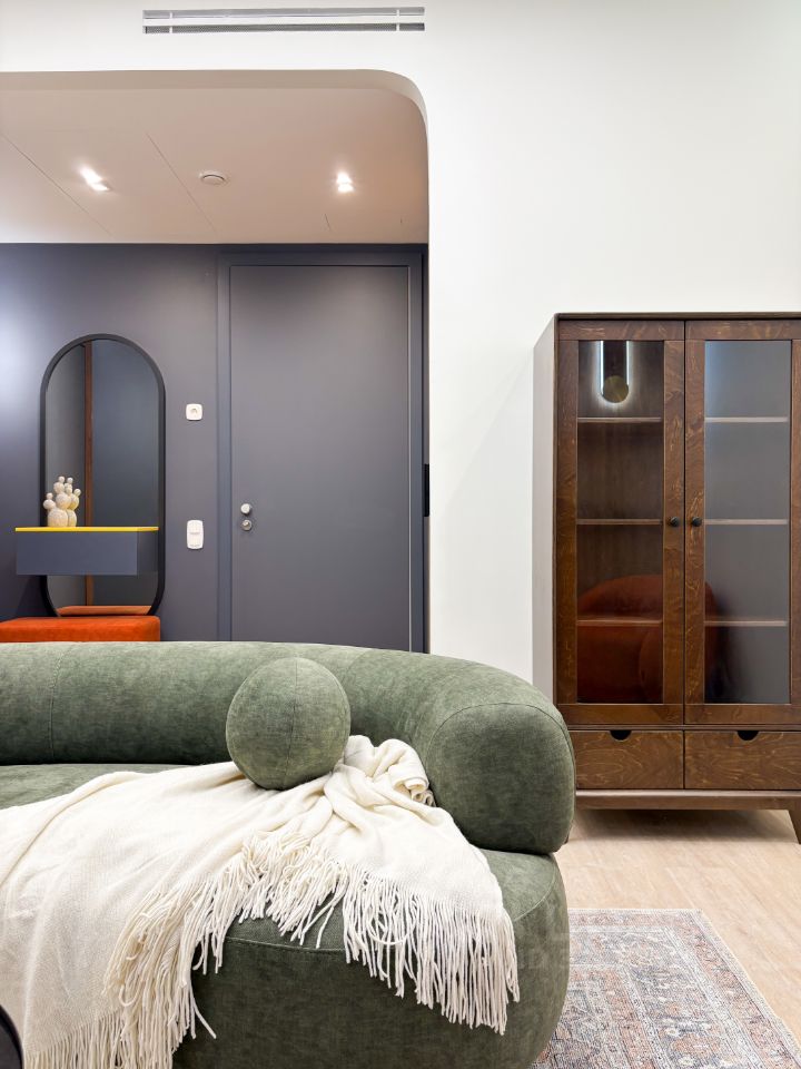 - гостиная зона: телевизор, стильный диван с кресломи, журнальный столик;