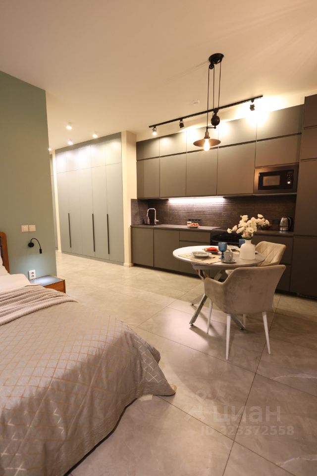 Функциональная студия полностью готова к заселению, включая постельное белье, полотенца, посуду. Вам останется только надеть тапочки и включить любимую ТВ программу.