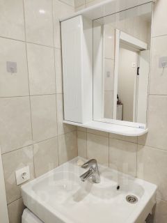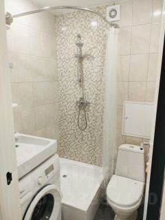 Удобный раскладной диван, стол, функциональная кухня под единой столешницей с небольшим холодильником, микроволновой печкой и встроенной варочной панелью на две комфорки. Стиральная машина в с/у. В коридоре выделено место под одежду, обувница.