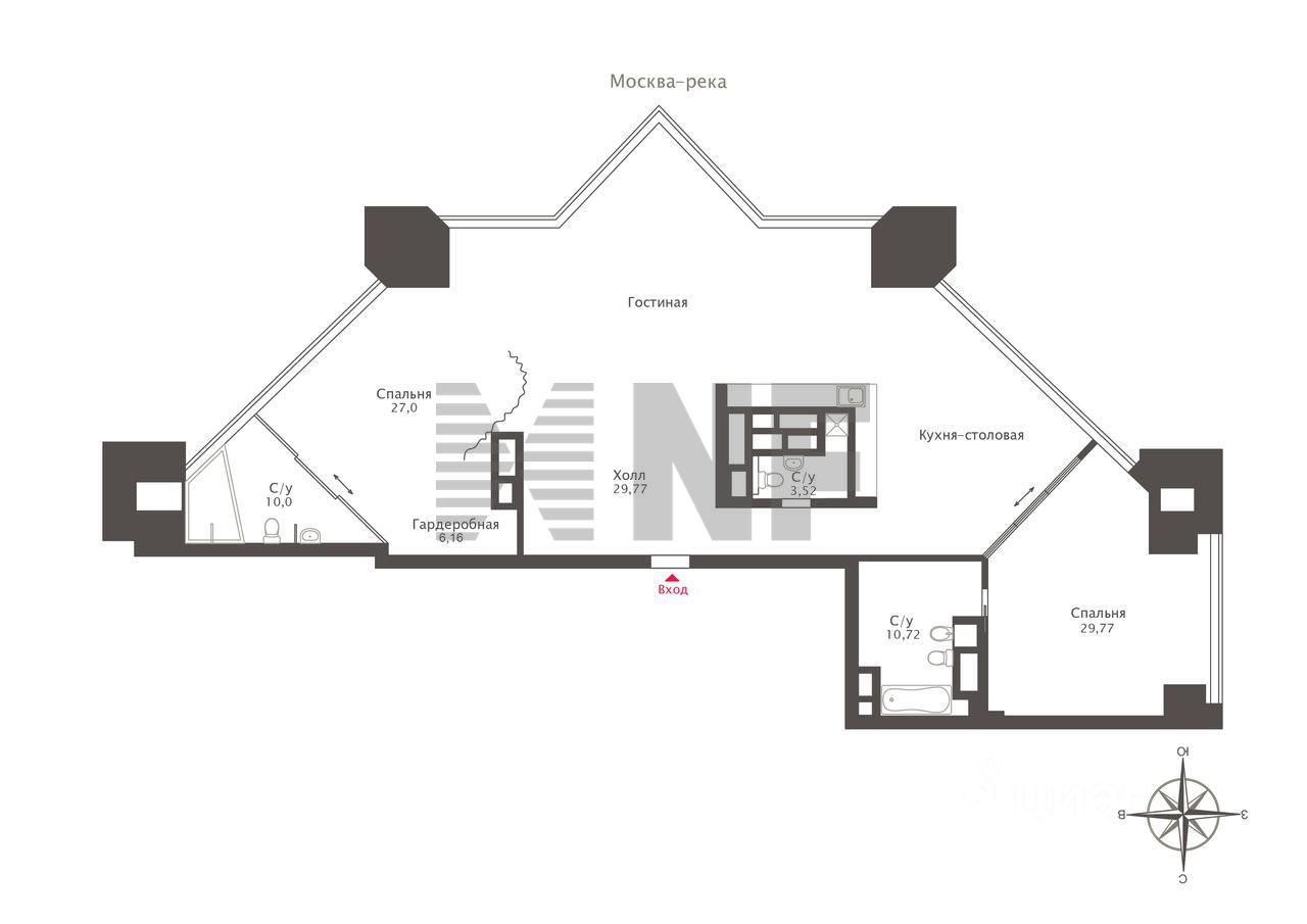 Планировка: гостиная-кухня, 2 спальни с собственными ванными комнатами, гардеробная, гостевой санузел.