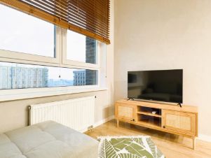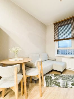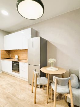 Просторная кухня-гостиная с уютным обеденным столом, раскладным диваном и смарт ТВ. Кухня оснащена бытовой техникой (индукционная варочная поверхность, холодильник, духовой шкаф, посудомоечная машина, вытяжка, электрочайник, фильтр для воды). Кондиционер.