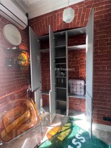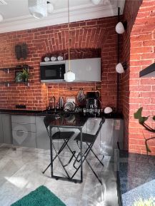 Родная кирпичная кладка в идеальном сочетании с серым керамогранитом под бетон и графитовой Встроенной кухней со столешницей из натурального итальянского гранита и дымчато-серой Встроенной кроватью с подъемным механизмом (графическая рельефная поверхность у кровати и встроенных шкафов).
