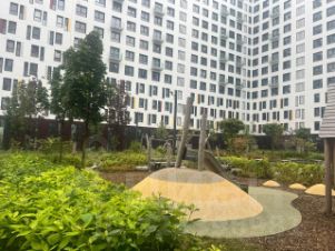 Вход в подъезд на уровне земли (удобно для родителей с маленькими детьми и людей с ограниченными возможностями), скоростные лифты. Имеются площадки для хранения колясок и велосипедов.